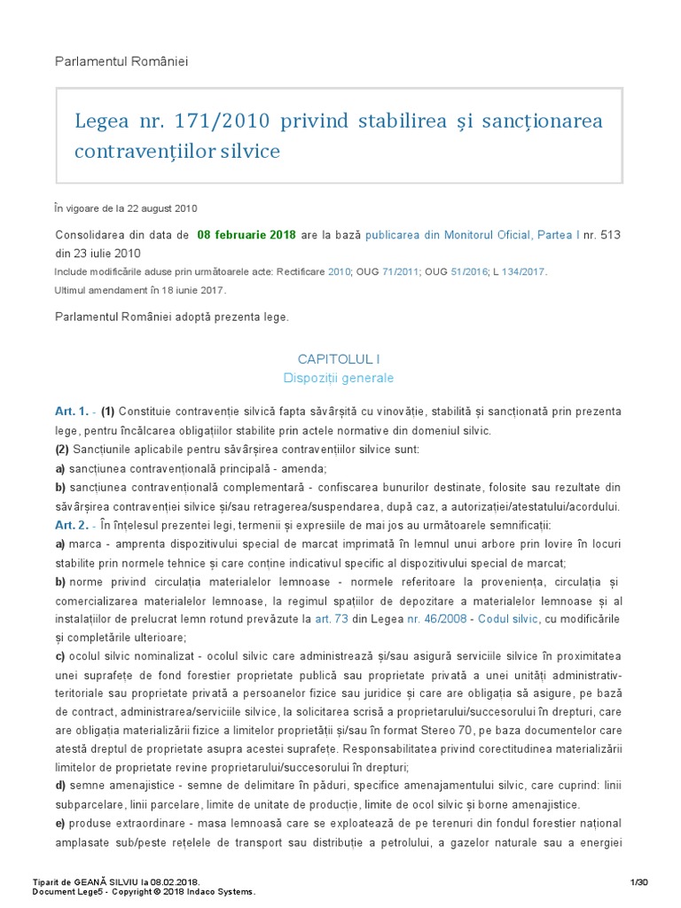 Materiale juridice (stiri, jurisprudenta, legislatie, articole juridice) cu privire la subiectul legea 171/2010. + capitolul i dispoziții generale + articolul 1(1) constituie contravenție silvică fapta săvârșită cu vinovăție, stabilită și sancționată prin prezenta lege, pentru.