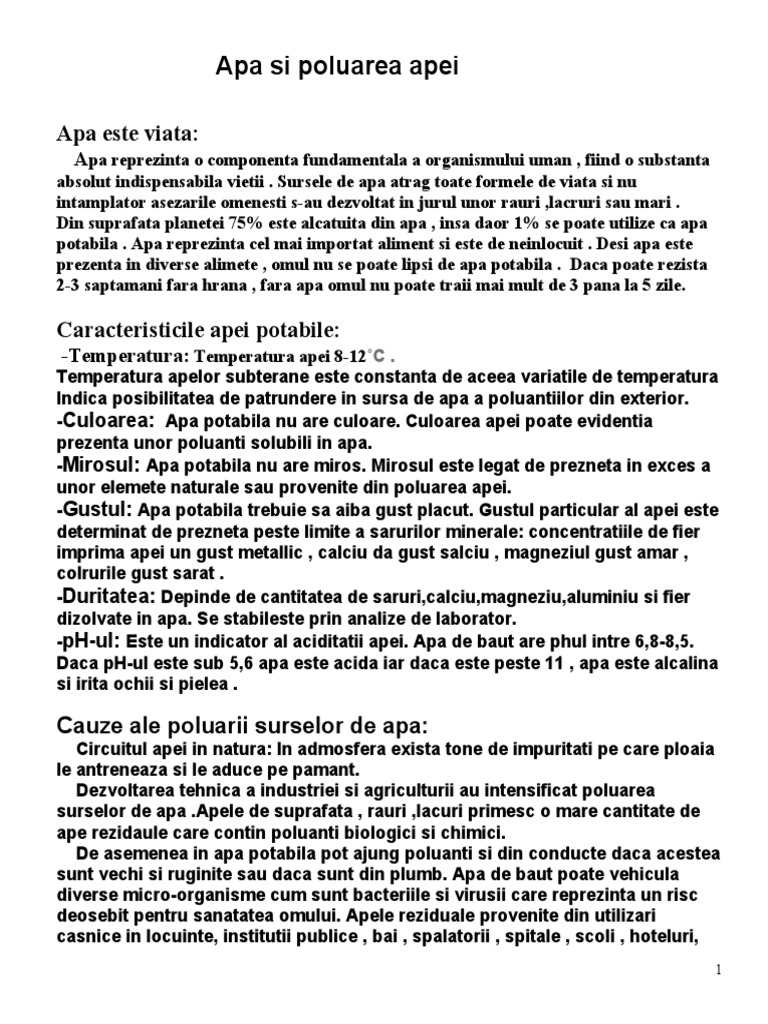 vizitati articolul complet aici : https://ro.scribd.com/doc/44695008/Referat-chimie-Apa-Si-Poluarea-apei-de-nota-9 Poluarea apelor poate fi naturală sau artificială. Referat despre importanta apei minerale zacaminte unul dintre cel mai bogat zacamant de apa minerala din europa este govora. Afectarea sănătăţii omului deteriorarea florei şi faunei acvatice slideshow.